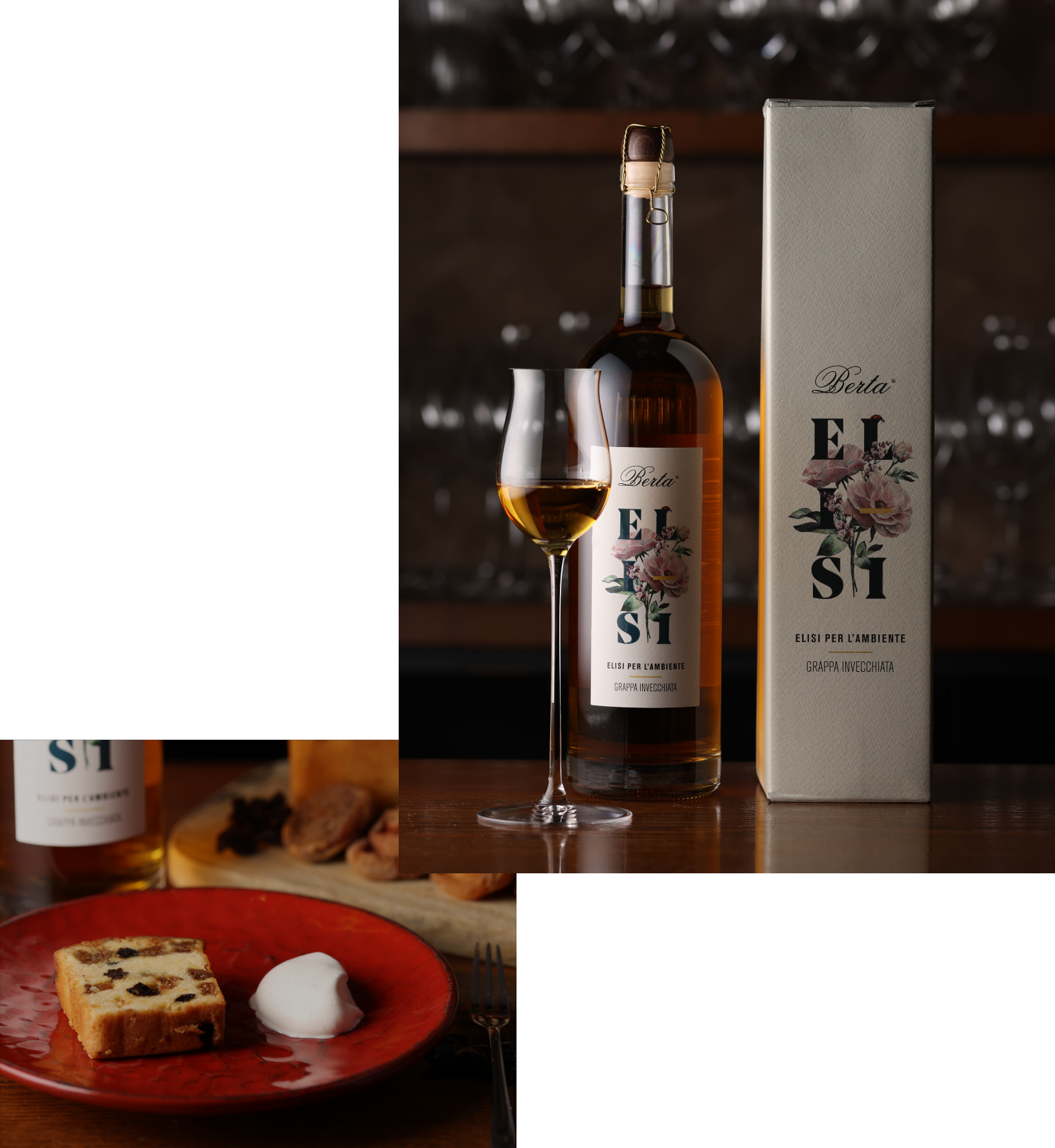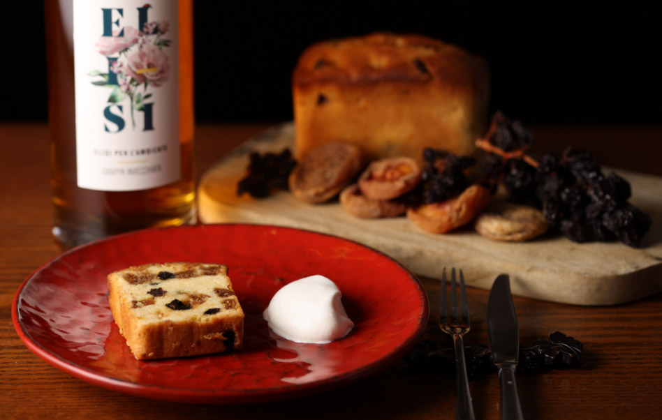 イタリア最高峰のグラッパ蒸溜所Berta社の樽熟成した「ELISi(エリージ)」で、ドライフルーツを数日間マリネ。それぞれの食感を活かしたサイズにカットして、生地にたっぷり混ぜ込みます。オーブンで焼き上げた後、フルーツの旨味と香りが加わったグラッパをケーキに含ませることで、グラッパ本来の香りがより際立つ仕立てです。甘さは控えめで、普段スイーツを召し上がらない方にも喜ばれています。